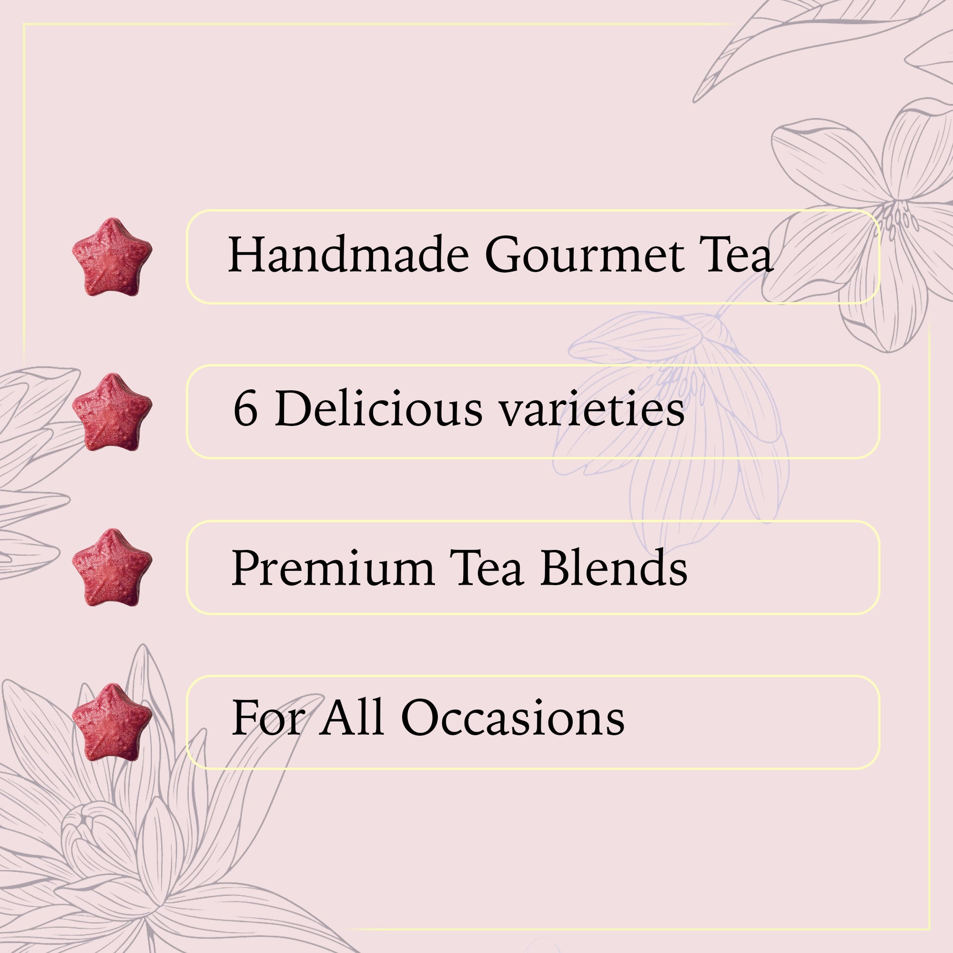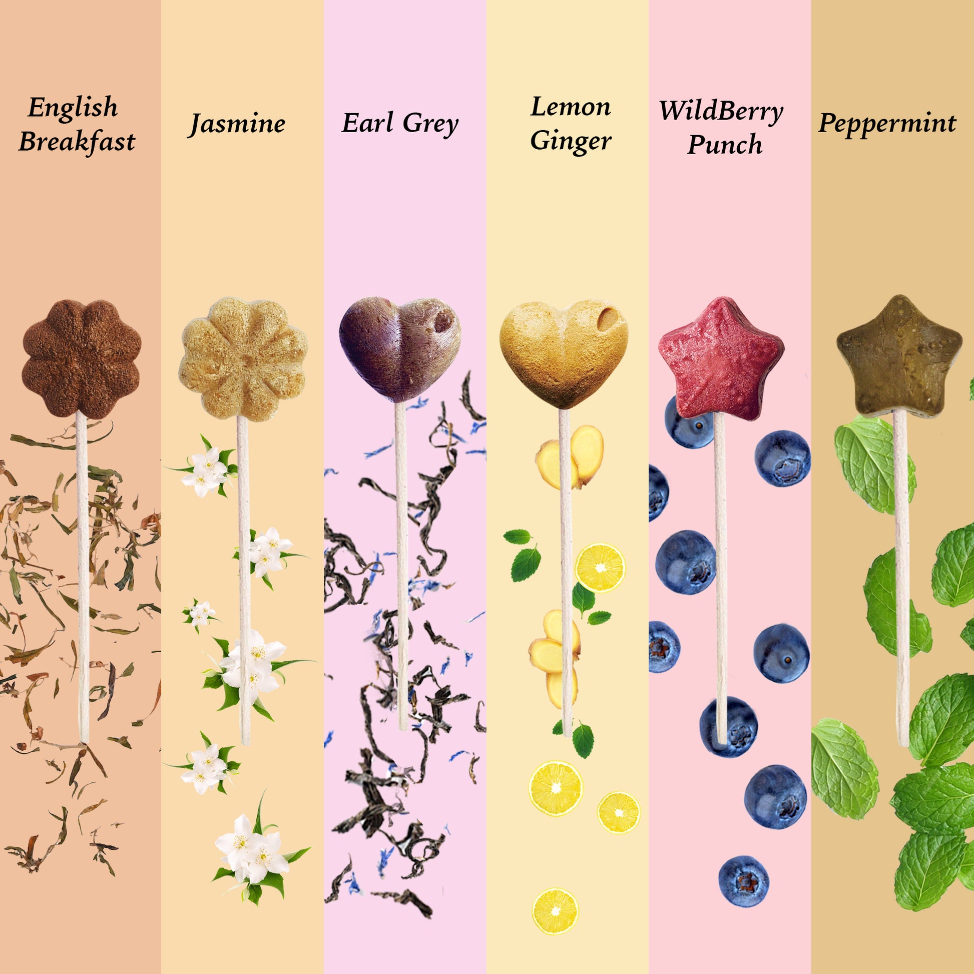 (Jasmine Green, Earl Grey, Lemon Ginger, Wildberry Punch, Peppermint and Peach Green Tea)